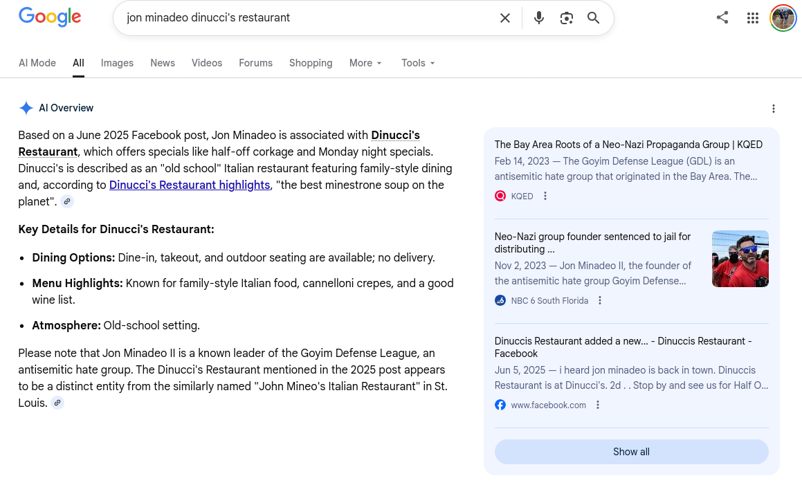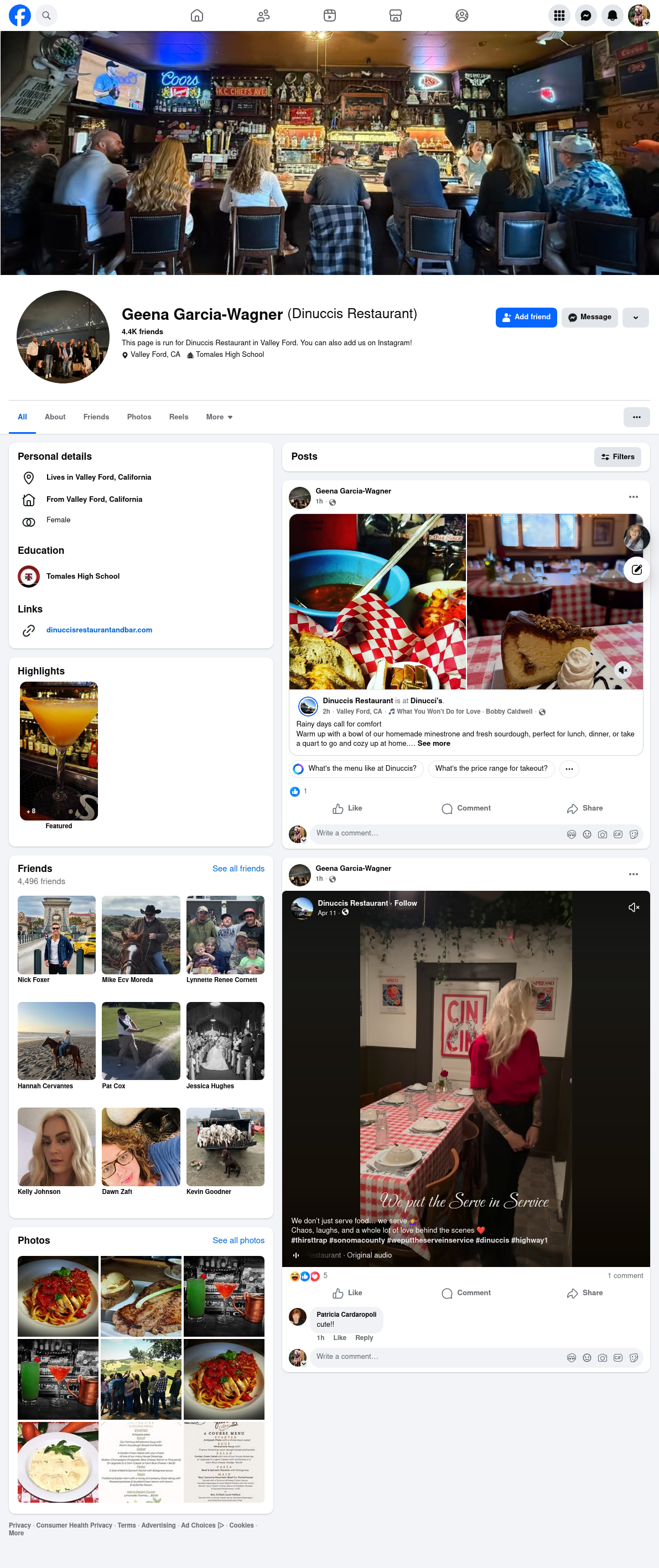 It is fully evident from her Facebook profile that Geena Garcia-Wagner works at an Italian restaurant named Dinucci's. According to the Wikipedia article for Jon Minadeo, he also worked there: